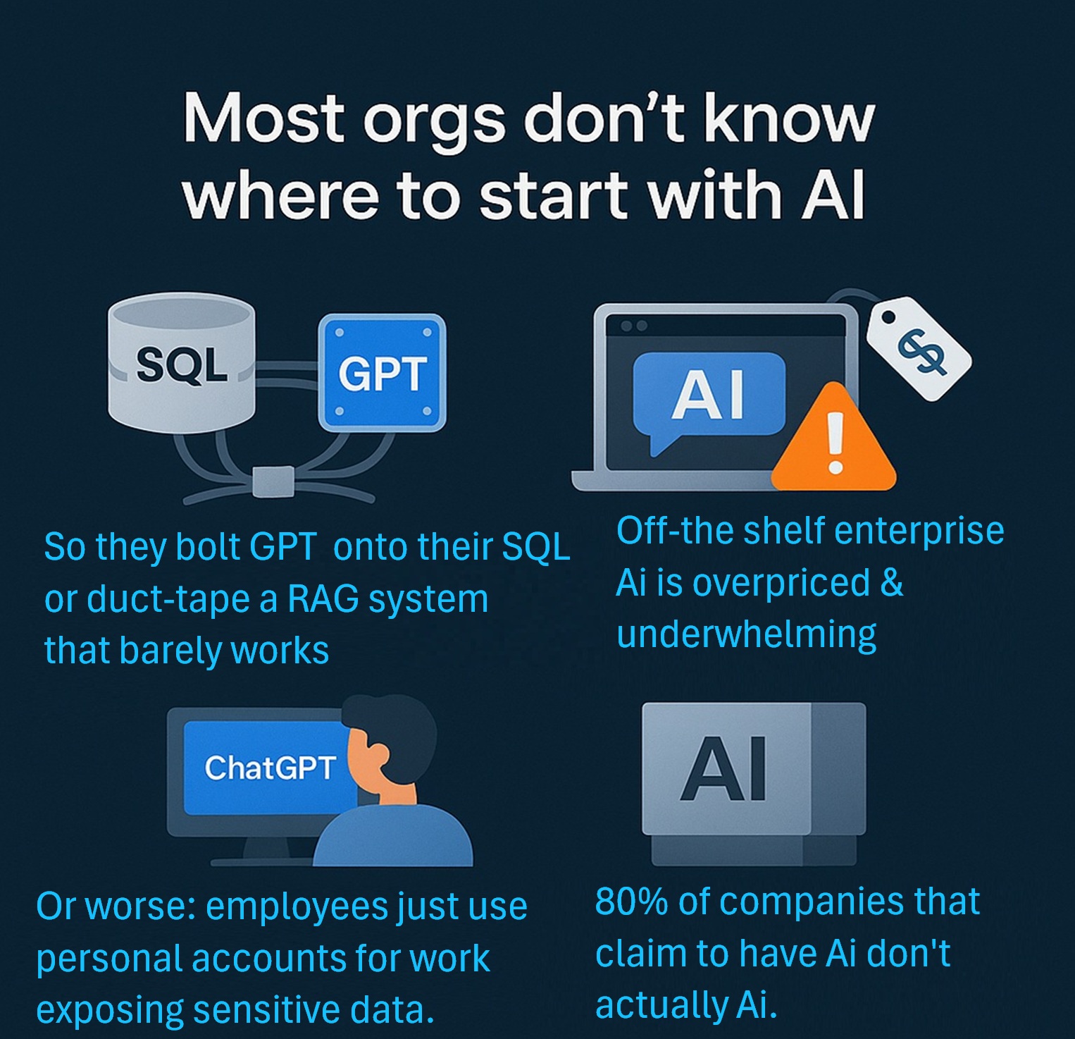 Some bolt GPT onto their SQL database and call it Ai. Others duct-tape together a brittle in-house RAG system that barely works and hope no one asks too many questions. And in the worst-case scenario, employees are pasting sensitive company data into their personal LLM accounts exposing sensitive data to public LLM API’s.